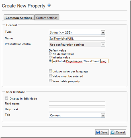 Now we need to add a thumbnail and preview URL for each page type. This is achieved by a simple trick, add two properties to the page called "SysThumbNailURL" and "SysPreviewURL" of type String (<=255). Don't show them in edit mode and give them a default value of the URL to the appropriate thumbnail or preview images for the page type. This allows us to access the default value as if it were meta data for the page type. An example showing "SysThumbNailURL" is shown below: