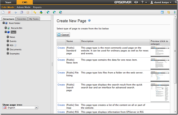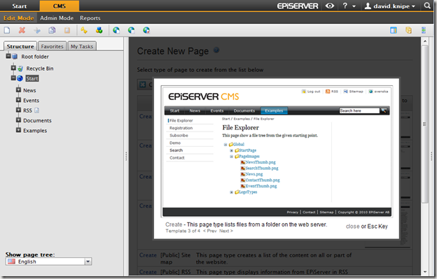 In any reasonable sized EPiServer installation its not uncommon that there are a lot of page types available when creating a new page. Often there are a bewildering array of page names/descriptions so I wanted to give editors a visual reference on the content they are creating. I decided to create a simple enhancement to the standard "Create New" screen in EPiServer which would allow users to see an image of the page before they create it.