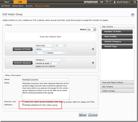 Enter the “Visitor Groups Statistics” gadget. This is a new gadget that has been added into the upcoming release of EPiServer CMS 6 R2. It allows editors to see the number of matching hits for a particular group. In order to enable the statistics for a group editors need to enable it when setting up a group by checking the “Enable statistics for this visitor group” checkbox when setting up a group: