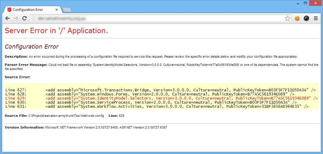 On starting your application you may get the following YSOD message "Could not load file or assembly 'System.IdentityModel.Selectors, Version=3.0.0.0, Culture=neutral, PublicKeyToken=b77a5c561934e089' or one of its dependencies. The system cannot find the file specified.":