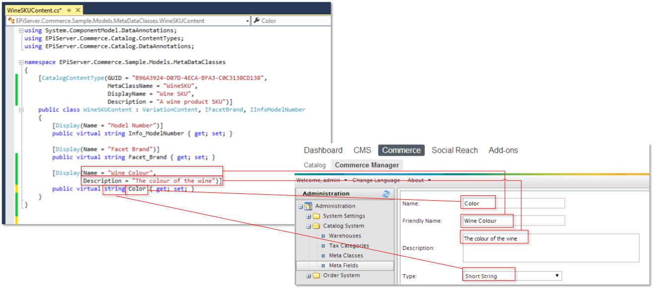 MetaField/MetaClass mapping can shorten front end integration time and ensures CMS developers who are familar with EPiServer 7.x can work with product data from EPiServer Commerce, just like any other content. The primary difference when working with MetaField/MetaClass mapping is that updates will affect the Catalog system (rather than the EPiServer Content database).