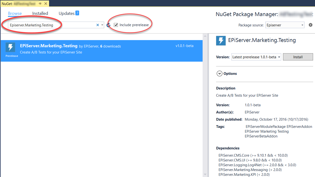 - Ensure the "Include prerelease" flag is ticked and search for "Episerver.Marketing.Testing":