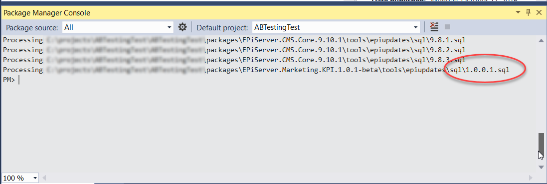 - Run the "update-epidatabase" command in the Package Manager window to install the necessary (note the final script executed which install the necessary updates to the database for A/B testing):