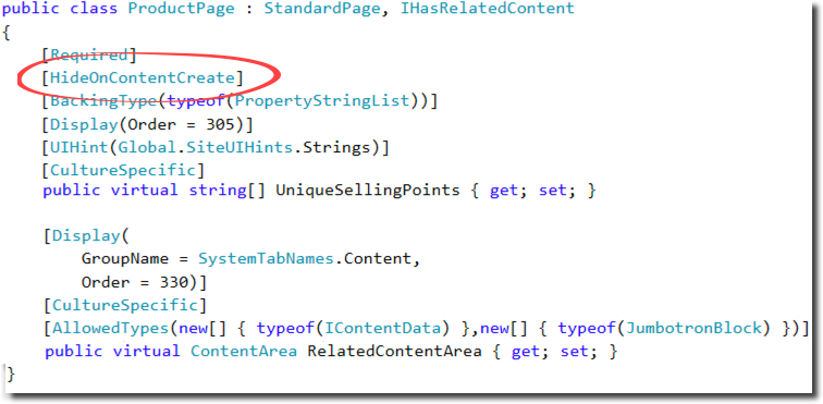 We can now mark content models with our new [HideOnContentCreateAttribute] attribute but use the standard [Required] attribute too: