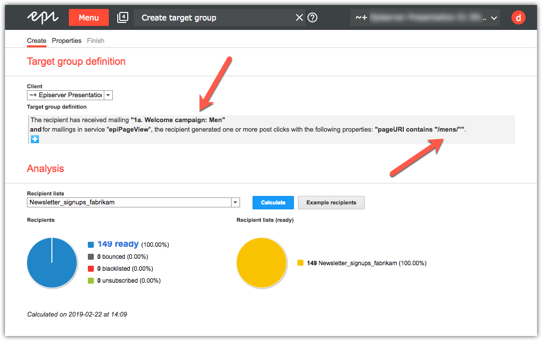 Example - target group for users who have viewed pages with /men/ in the URL and received an outbound campaign email