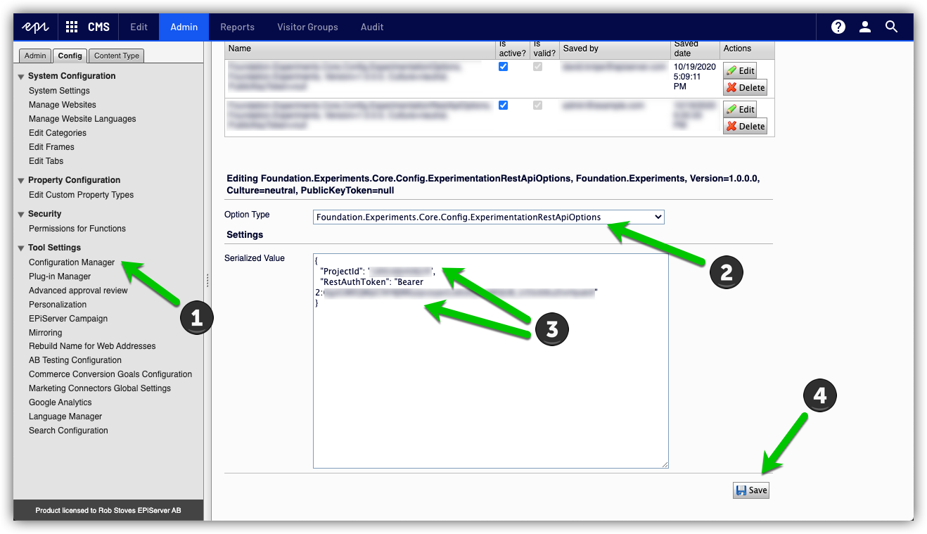 Copy the authentication token value and in Admin mode > Tools > Config Manager select the "ExperimentationRestApiOptions" class and enter the project id and API token as shown below: