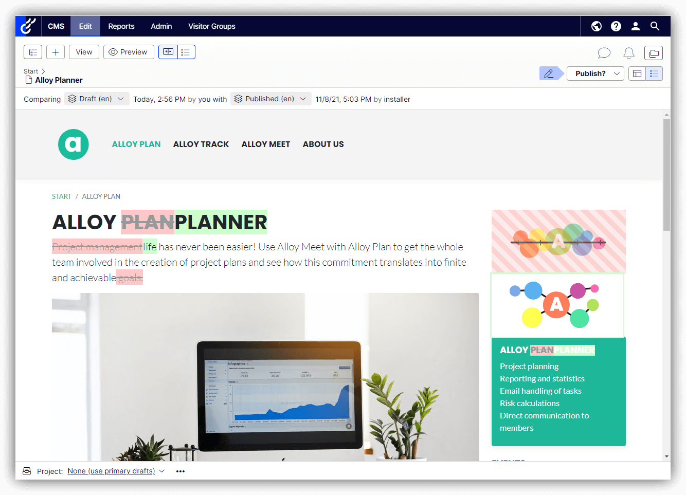 Visual Compare is an add on for Optimizely CMS 11 and 12 that allows editors to get a red / green comparison view when comparing versions of content: